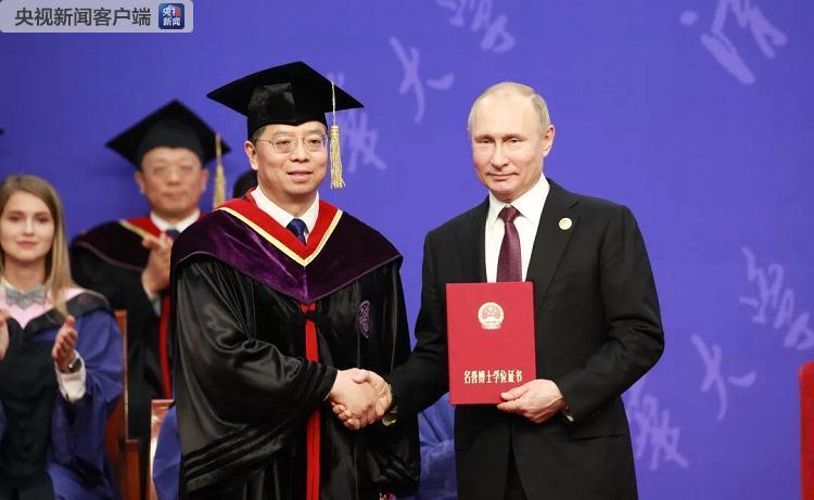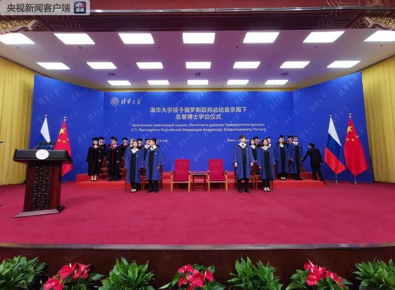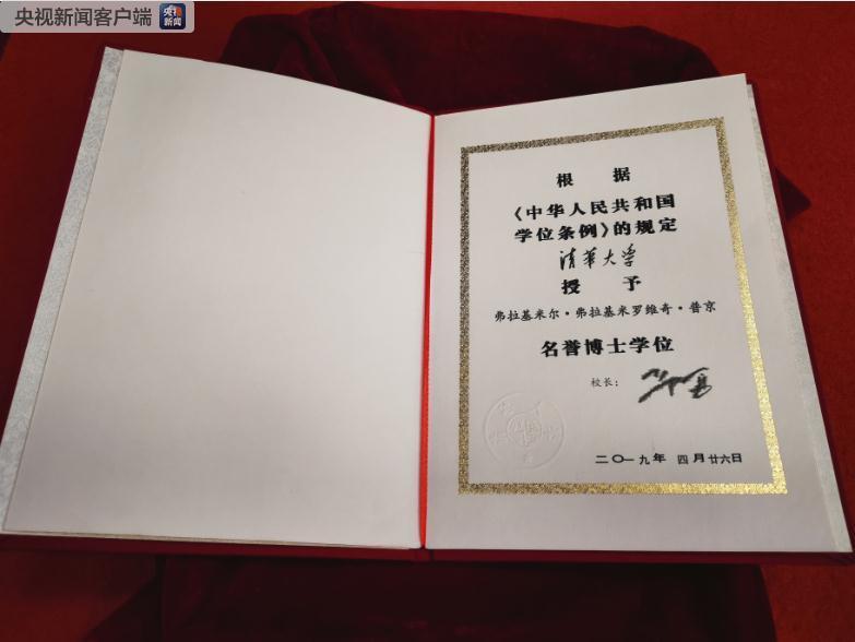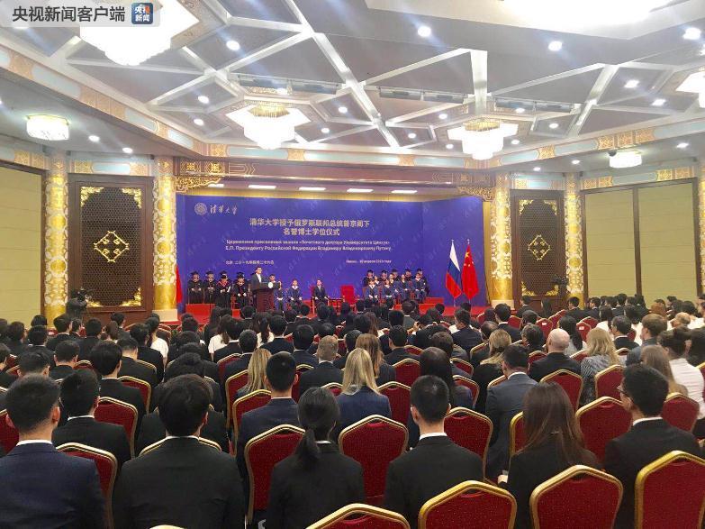 在习主席见证下,清华大学校长邱勇向普京总统颁发了名誉博士证书。普京在接受证书时说:清华大学是举世闻名的大学,也是习主席的母校,培养了很多优秀人才。今天,在我的好朋友习主席见证下,清华大学向我授予名誉博士学位并举行隆重仪式,我感到很荣幸,也深受感动。