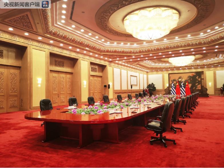 习和希腊总理齐普拉斯在人民大会堂东大厅举行会谈。(央视记者张晓鹏拍摄)