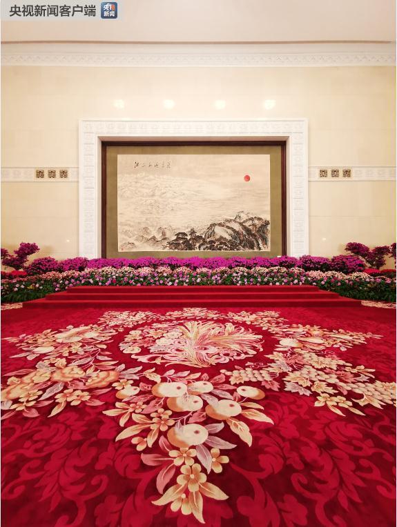 迎宾仪式在人民大会堂二层巨幅山水画《江山如此多娇》前举行。《江山如此多娇》是中国当代画家傅抱石和关山月以的《沁园春·雪》为题材,于1959年合作创作的。(央视记者张晓鹏拍摄)