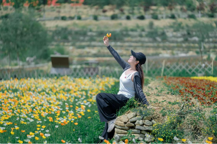 紧接着,巡访团来到坐落于平阴县玫瑰镇的芳蕾玫瑰花乡。入园的第一刻,千亩花海裹挟着沁人心脾的香气带来视觉和嗅觉的双重冲击,这里三面环山,远眺多佛古塔,南面翠山环抱,绿水穿行而过,花团锦簇,美不胜收。小伙伴儿们徜徉在虞美人、蓝香芥的花海中拔不动腿,竞相打卡“花丛中的人生照片”。来此漫步千亩花海,体验古法制酱、精油DIY,还能打卡波音787飞机餐厅,品尝玫瑰宴席,岂不快哉!五一将至,芳蕾的玫瑰正为您的到来含苞待放。
