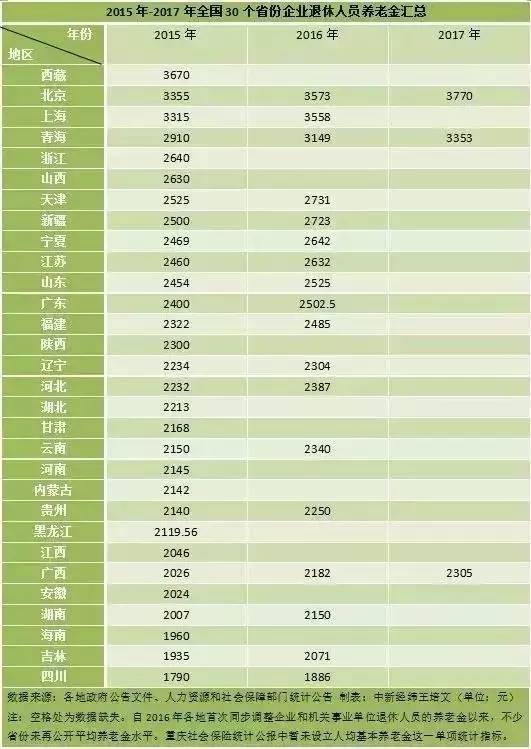 据目前已有的公开数据显示,西藏、北京、上海、青海四个地方的企业退休人员月均养老金均已超过3000元,排在全国前列;四川2015年、2016年企业退休人员月均养老金均未超过2000元,排在全国垫底位置。